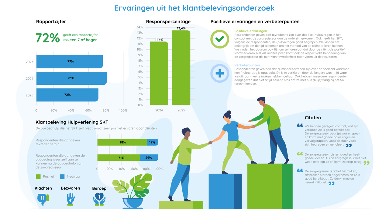 Als dienstverlenende organisatie vinden wij het belangrijk om te weten hoe cliënten onze ondersteuning ervaren. Dit toetsen we op verschillende manieren, zoals met het klantbelevingsonderzoek en via het platform SKT Talks. Hieronder een weergave van de ervaringen.