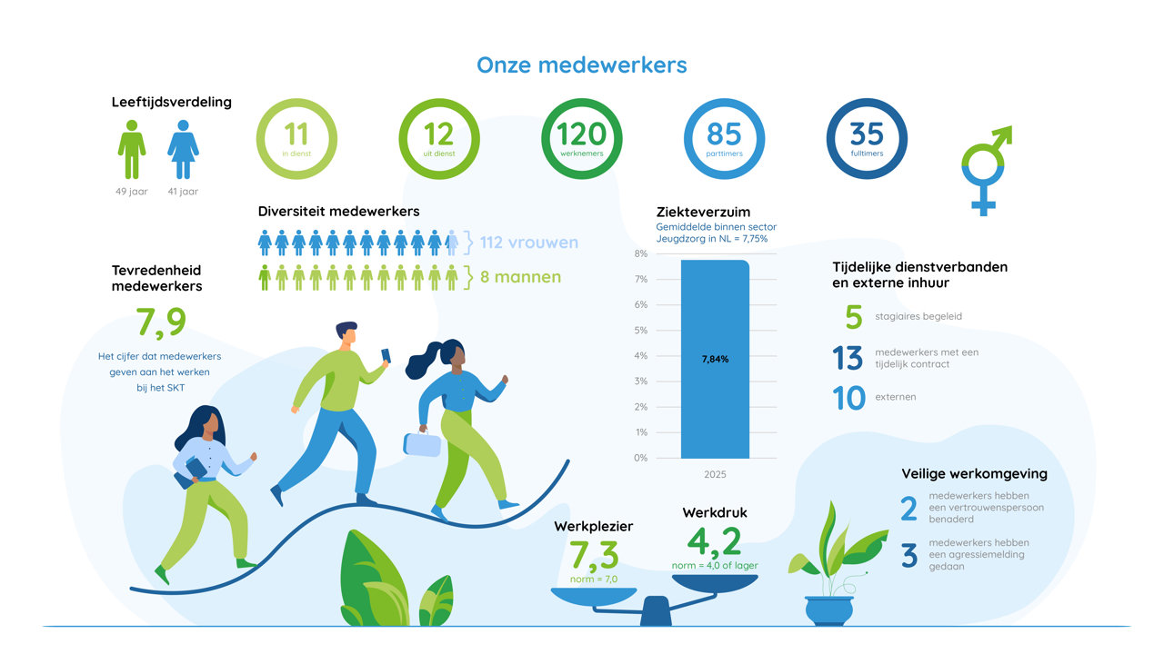 Aandacht voor sociale veiligheid komt op verschillende manieren terug binnen de organisatie: tijdens meetings zoals bilaterale en multidisciplinaire overleggen, maar ook door het gebruik van de app Everybody Frank voor het meten van de medewerkerstevredenheid. Daarnaast besteden we aandacht aan dit onderwerp binnen onze SKT Academy (een persoonlijke, digitale leeromgeving), in het agressiebeleid en het -protocol, door nazorg aan de leidinggevenden en/of collega’s en de inzet van de externe vertrouwenspersoon.